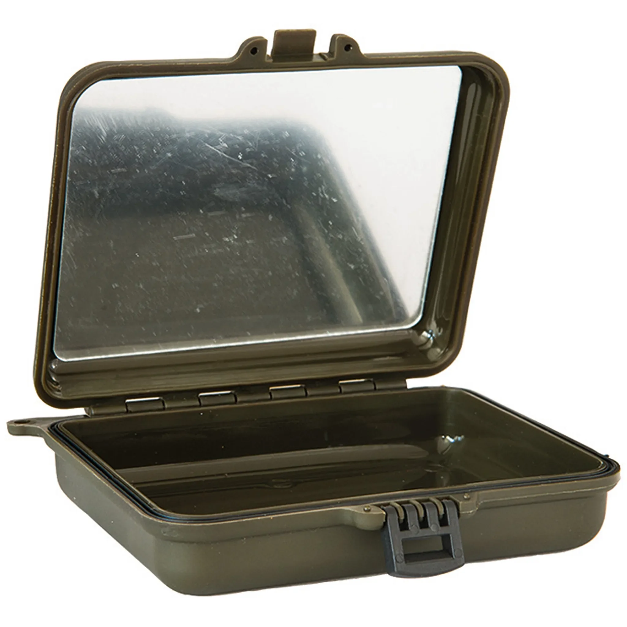 | Ausstattung | Schnappverschluss, Gummidichtung, Spiegel im Deckel, Öse für Befestigung |