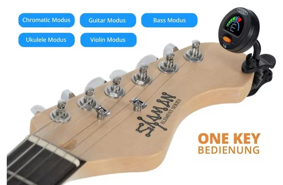 - Chromatischer Clip-Tuner mit 5 Modi (Chromatisch, Gitarre, Bass, Ukulele, Violine) für vielseitige Anwendungen.