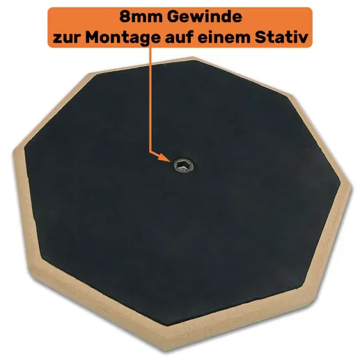 Dank Korpus aus Holz und einer rutschhemmenden Schaumstoffrückseite lässt sich das Practice Pad leise und stabil auf Tischen oder anderen ebenen Flächen nutzen. Alternativ ermöglicht das 8 mm Gewinde an der Rückseite die Montage auf einem passenden Stativ.