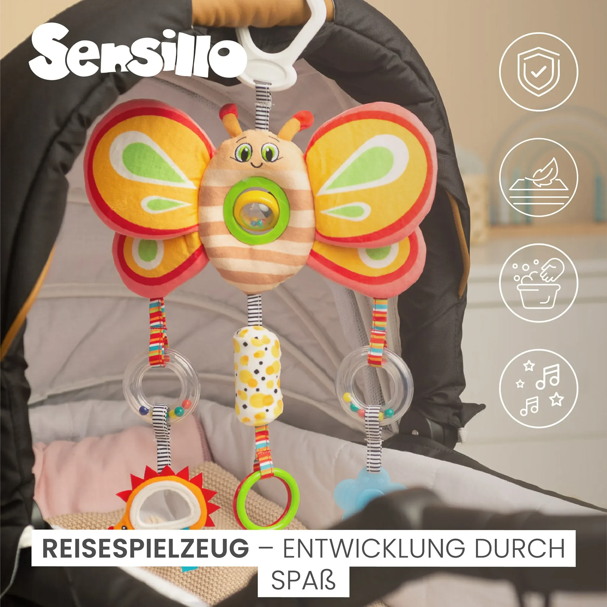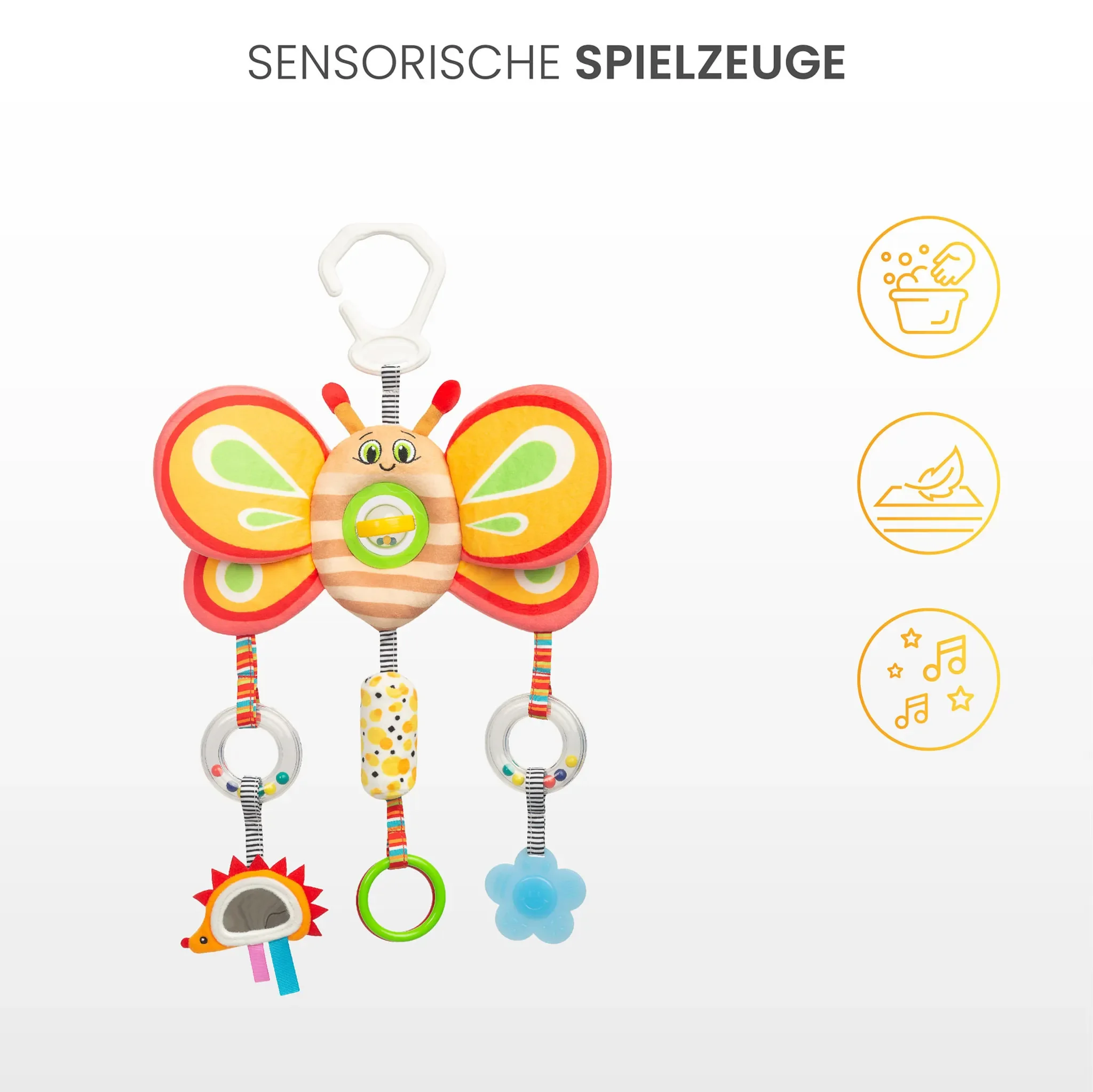 Highlights: Mehrere abnehmbare sensorische Anhänger, fördert Sehen, Hören, Tasten und Feinmotorik, fröhliches Design mit starken Farbkontrasten, ideal für Alltag und Reisen.