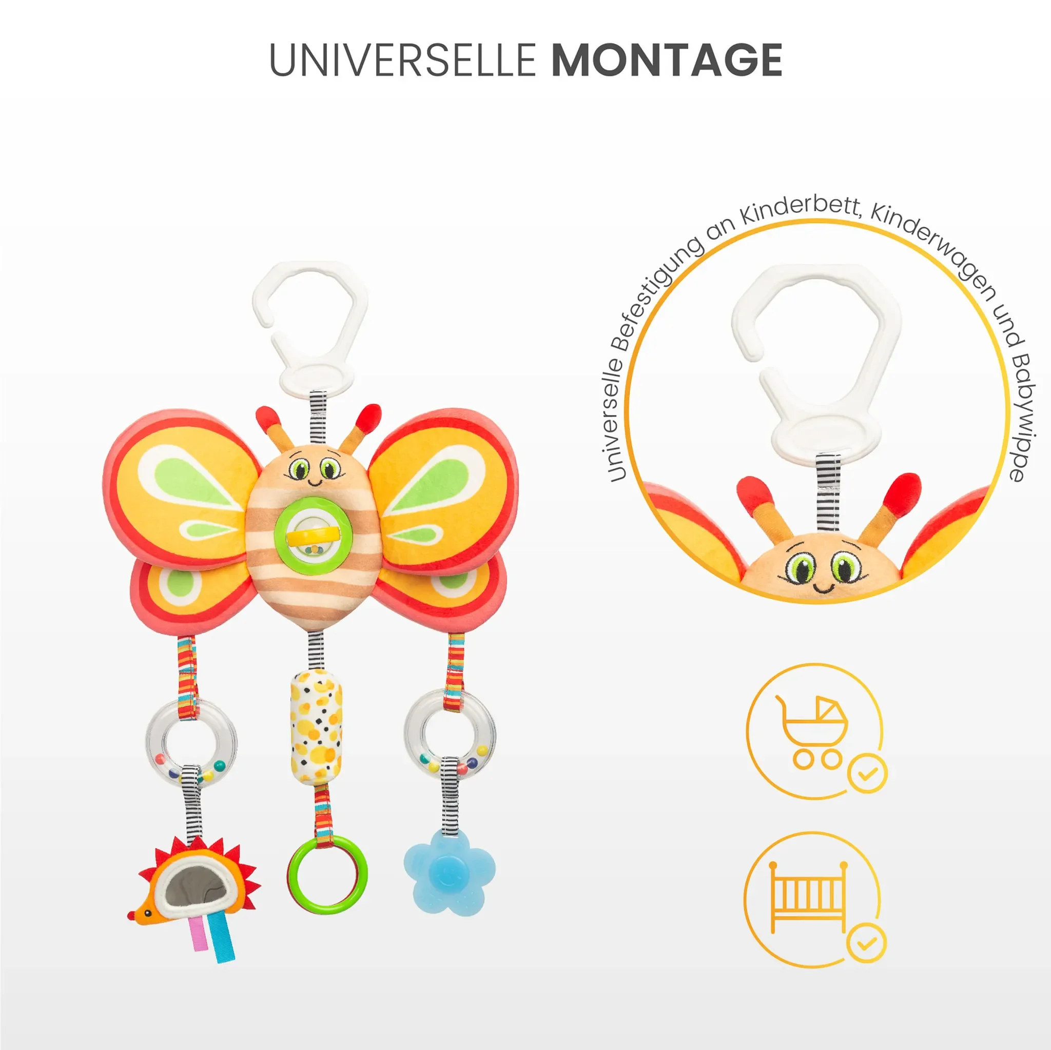 Dank der flexiblen Universalbefestigung lässt sich das Spielzeug sicher am Kinderwagen, Autositz oder am Bettchen anbringen. Unterschiedliche sensorische Anhänger wie Rassel, Spiegel, Quietsche und weiche Materialien mit variierenden Texturen unterstützen die motorische und sensorische Entwicklung bereits ab den ersten Lebenstagen.