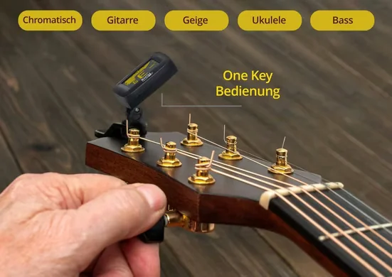 - Fünf Betriebsarten: Chromatisch, Gitarre, Violine, Ukulele und Bass für passgenaue Stimmführung je Instrument.