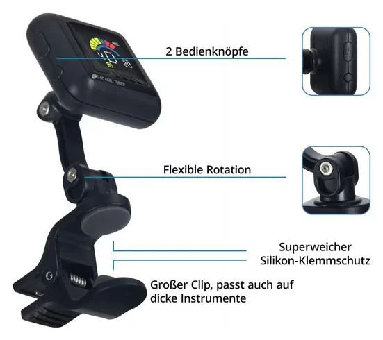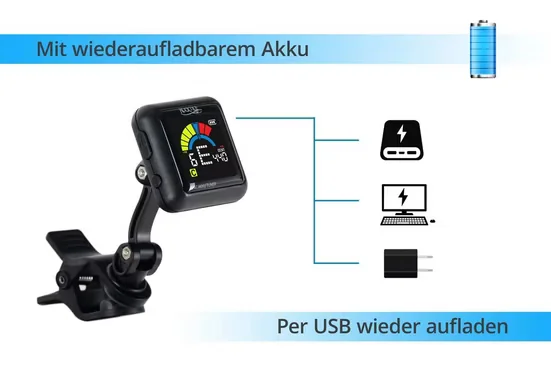 Ein integrierter, wiederaufladbarer Akku reduziert den Bedarf an Einwegbatterien. Der 360° drehbare Kopf mit zwei Gelenken erlaubt eine flexible Ausrichtung, während die Klemme mit weichem Silikon-Schutz das Instrument schont. Mit seiner kompakten Bauform und der übersichtlichen Bedienung mit zwei Tasten ist der Tuner auf eine unkomplizierte Nutzung ausgelegt.
