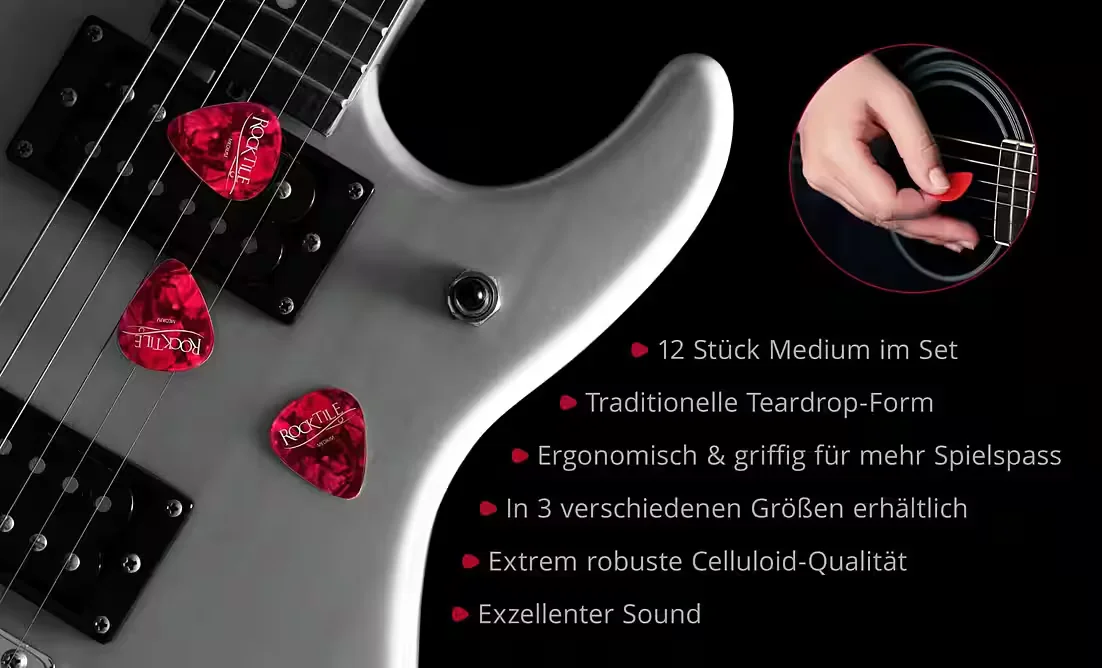 Dieses Set umfasst 12 standardförmige Gitarrenplektren in traditioneller Teardrop-Form. Das Material aus Zelluloid mit glatter Oberfläche sorgt für ein authentisches Spielgefühl und übermittelt einen warmen, runden, musikalischen Ton. Das Tortoise Design verleiht den Plektren eine ansprechende Optik, die zeitlos wirkt.