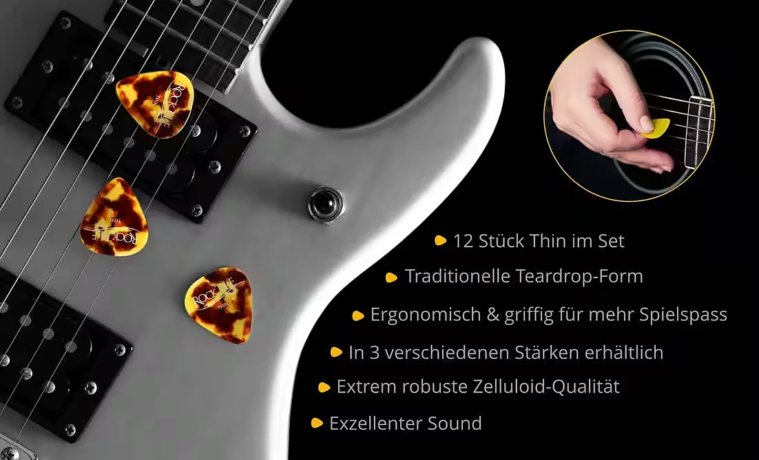 Dieses 12er-Set Gitarrenplektren in traditioneller Teardrop-Form richtet sich an Spielerinnen und Spieler, die ein natürliches Anschlagsgefühl und einen warmen, runden Ton bevorzugen. Das robuste Zelluloid in Tortoiseoptik bietet eine glatte Oberfläche, die angenehm in der Hand liegt und ein kontrolliertes Gleiten über die Saiten ermöglicht.