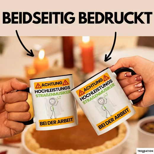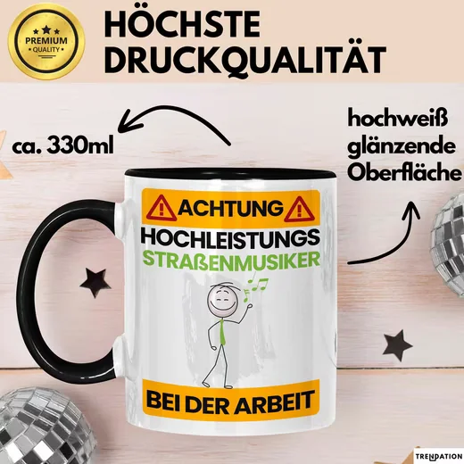 Diese schwarze Keramiktasse ist als witzige Aufmerksamkeit für einen Straßenmusiker konzipiert und eignet sich für Geburtstage, Weihnachten oder weitere Anlässe. Das beidseitige Motiv macht sie im Alltag unkompliziert nutzbar – unabhängig davon, ob sie in der rechten oder linken Hand gehalten wird.